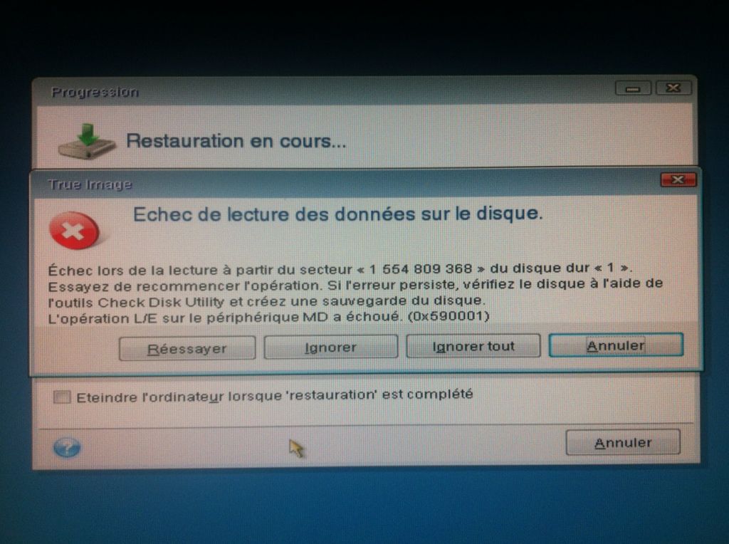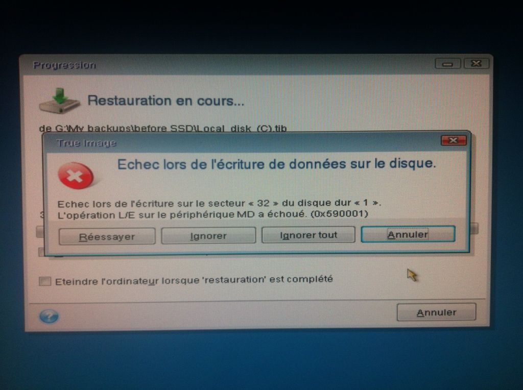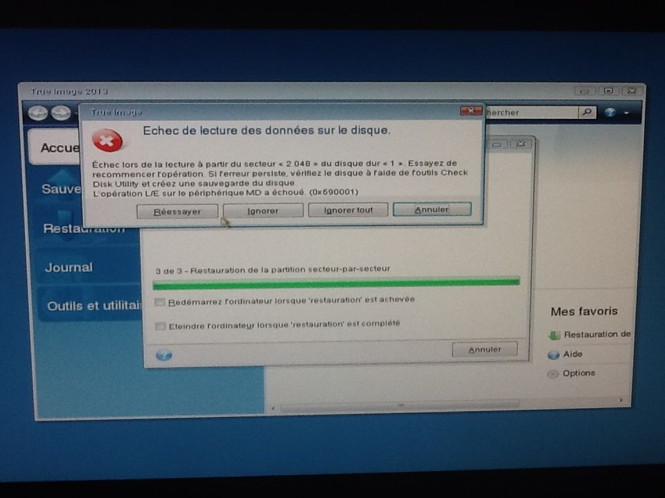 This time, everything seemed to work fine.. The restoration process went ahead, and was nearly completed, when I got this error message, and then plenty of other similar message.. I tried "try again" (reessayer) but it never worked, so I had to ignore all the error message. At the end, I got a "restore process succeeded" message, but when I start booting it say that my system is missing a boot....