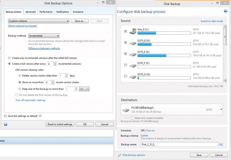 I don't want to use disk mode as there are two more partiti0ns on that drive that I do not want to backup. All I want is C: (128MB SSD) and the first two partitions on the 1.5 Terabyte drive (D: and E:). I want 1 full and 6 incremental, max of 4 chains.